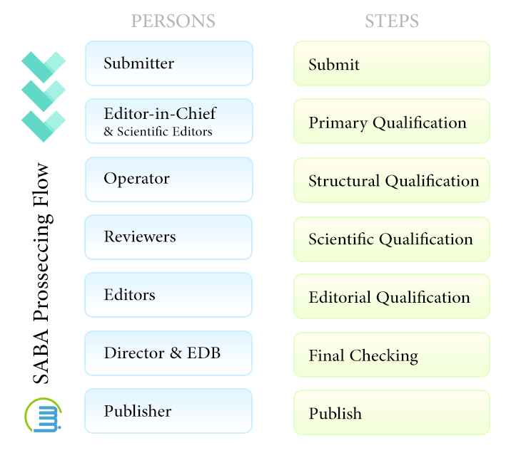 در جدول زیر مسیر فرضی یک مقاله از دریافت تا انتشار را مشاهده می کنید. البته اگر سیستم مالی سبا را تنظیم کرده باشید در مراحل مربوطه مقاله وارد وضعیت آماده پرداخت هزینه می شود. دقت کنید که وقتی مقاله از خارج از سیستم دریافت می شود (مثلا از نویسنده یا داوران) ابتدا نزد کارشناس می شود تا بررسی کند و اگر لازم است آن را به دبیر علمی یا سایر افراد بفرستد. در ضمن امکان تکرار برخی فرآیندها مثل بررسی ساختاری، داوری و ویراستاری وجود دارد.